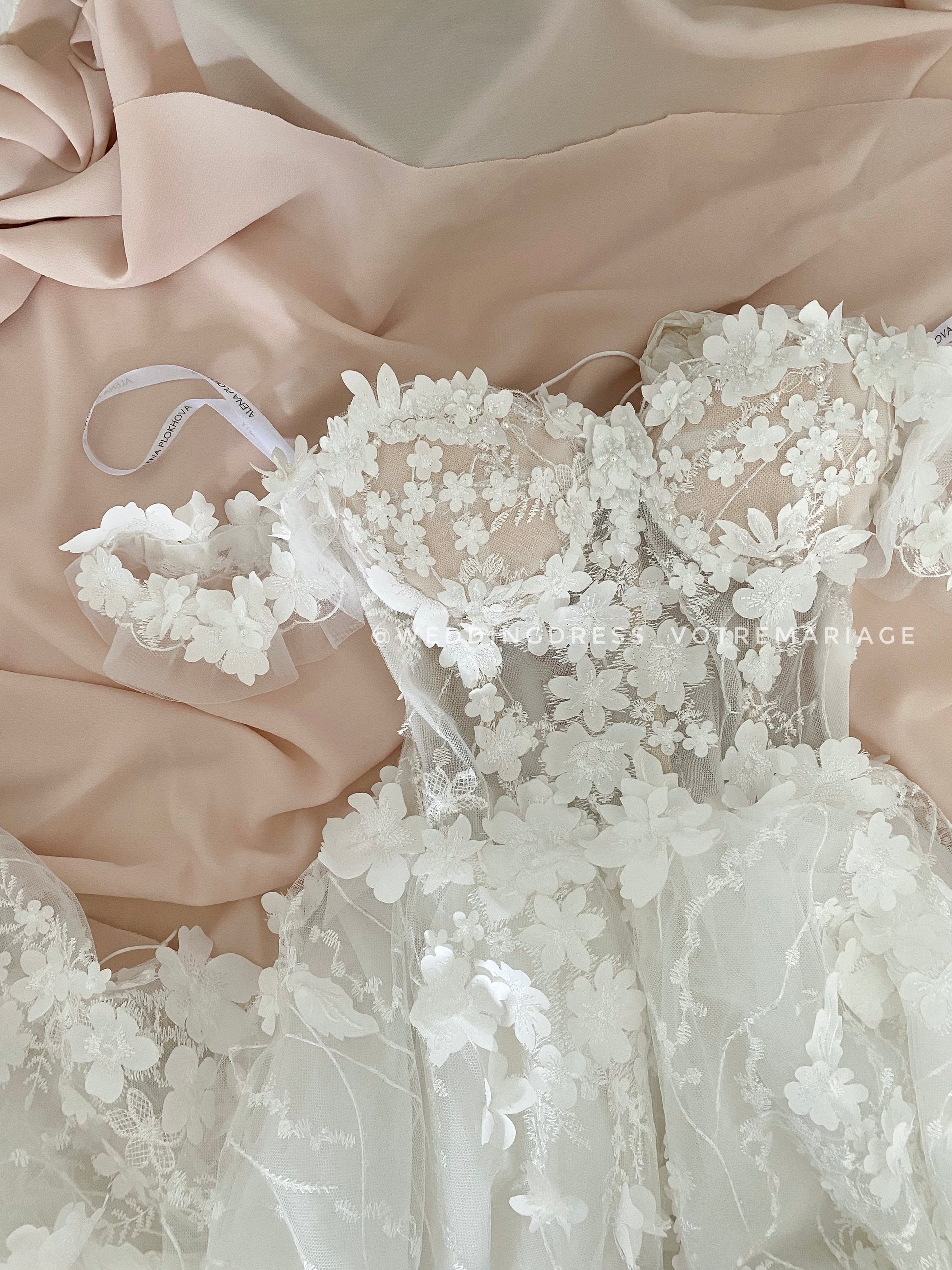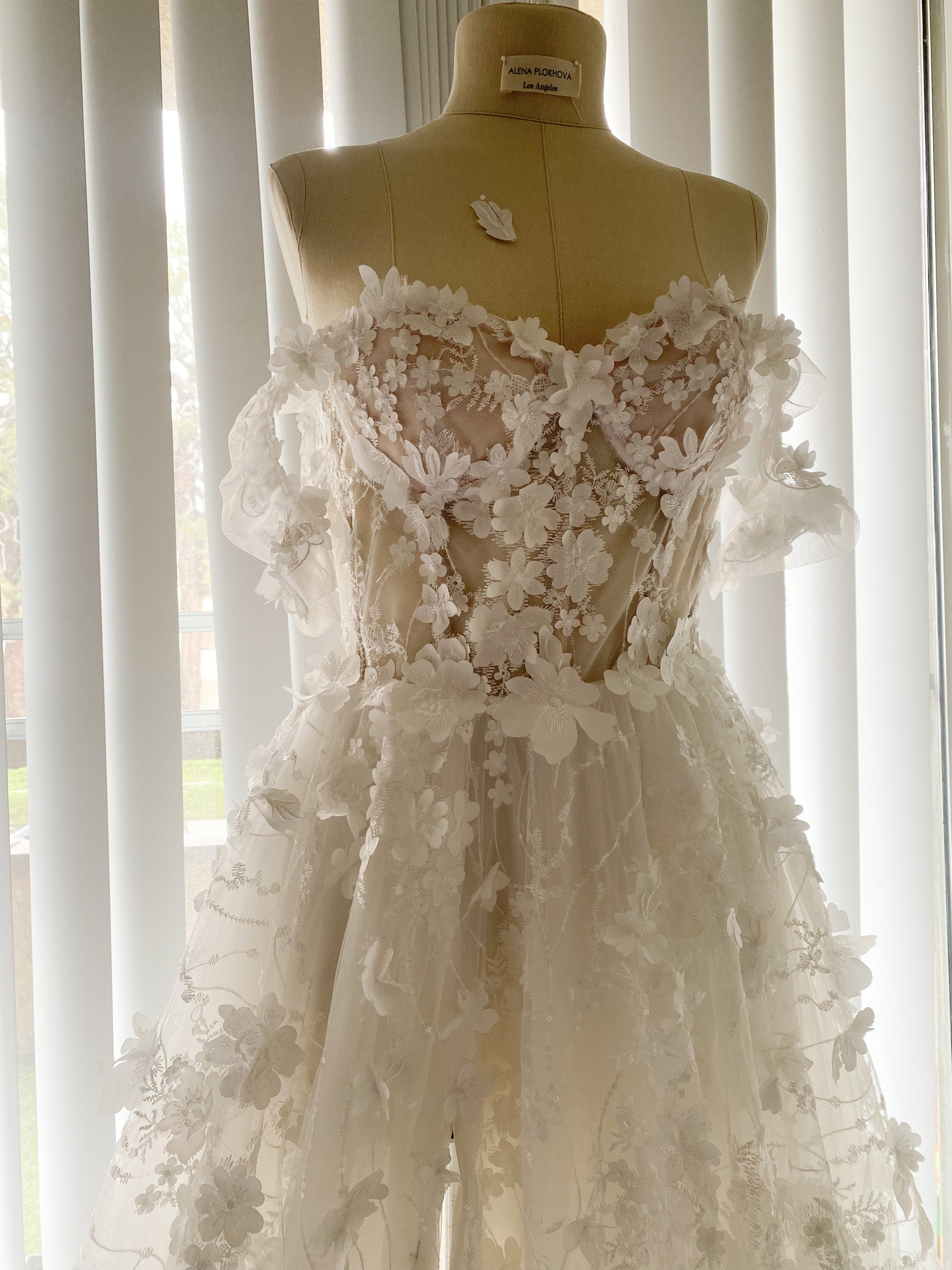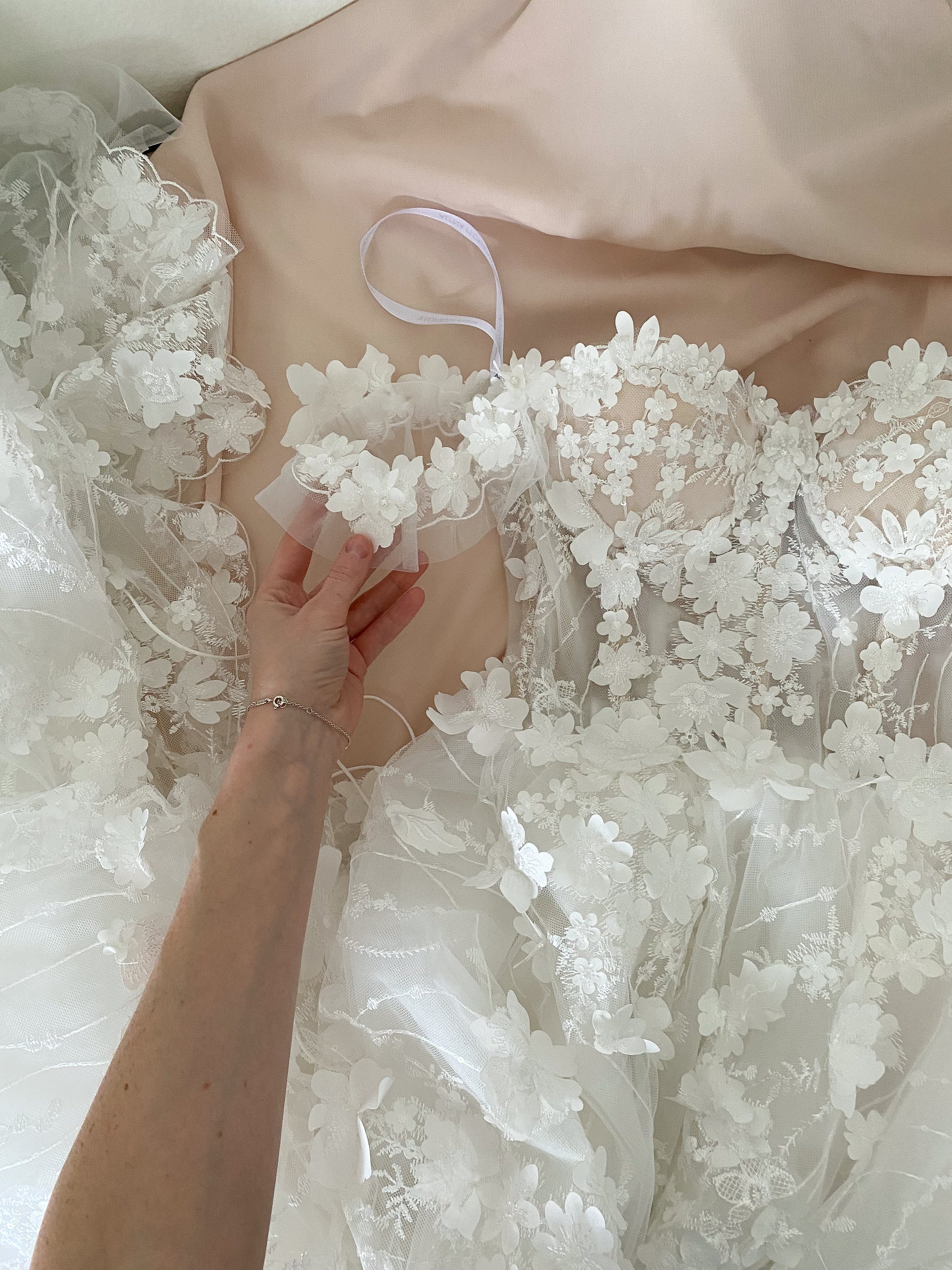- Materials: Italian tulle, lace, 3D flowers, satin (polyester).The dress is embroidered with sequins and several types of beads.