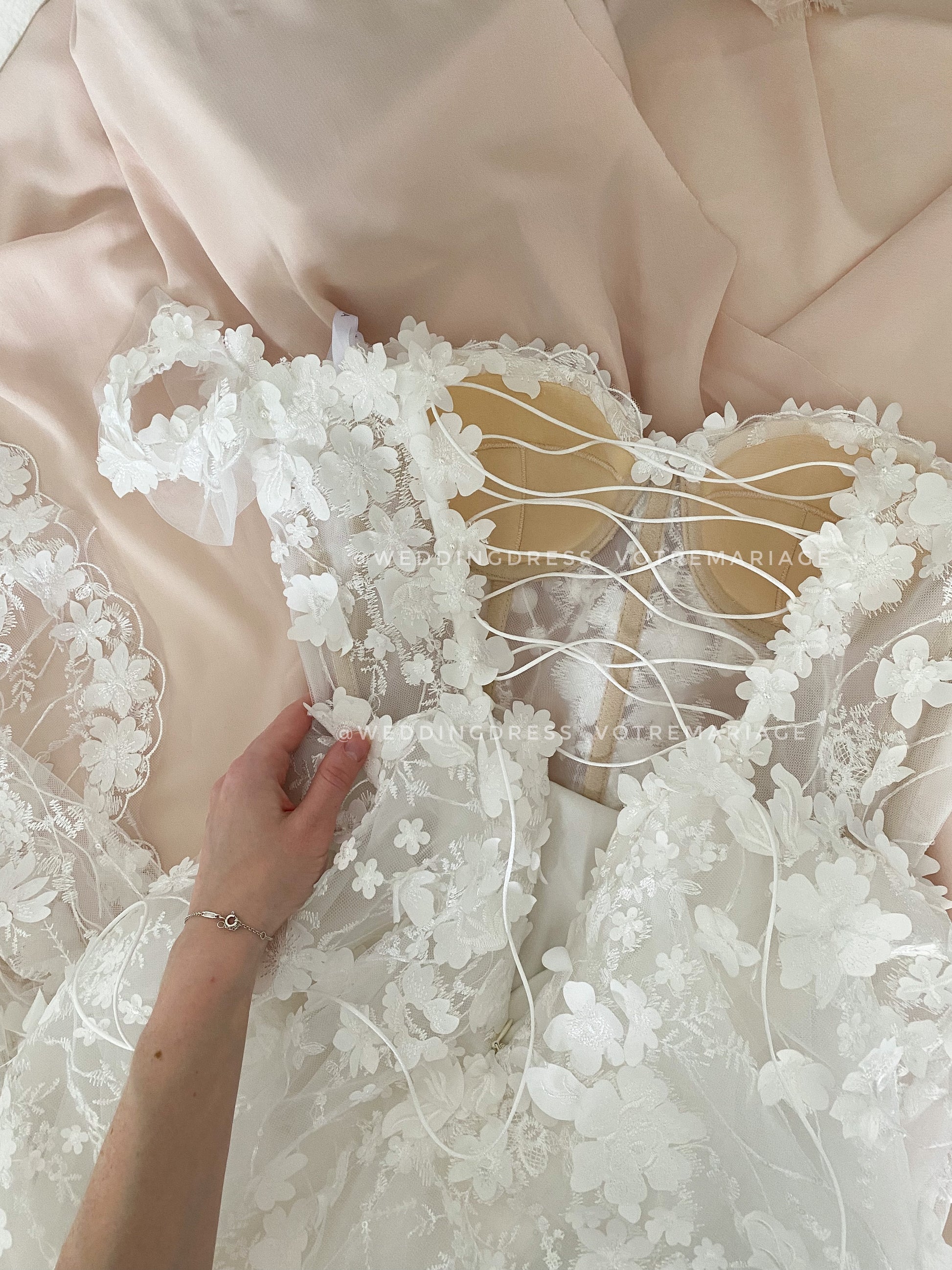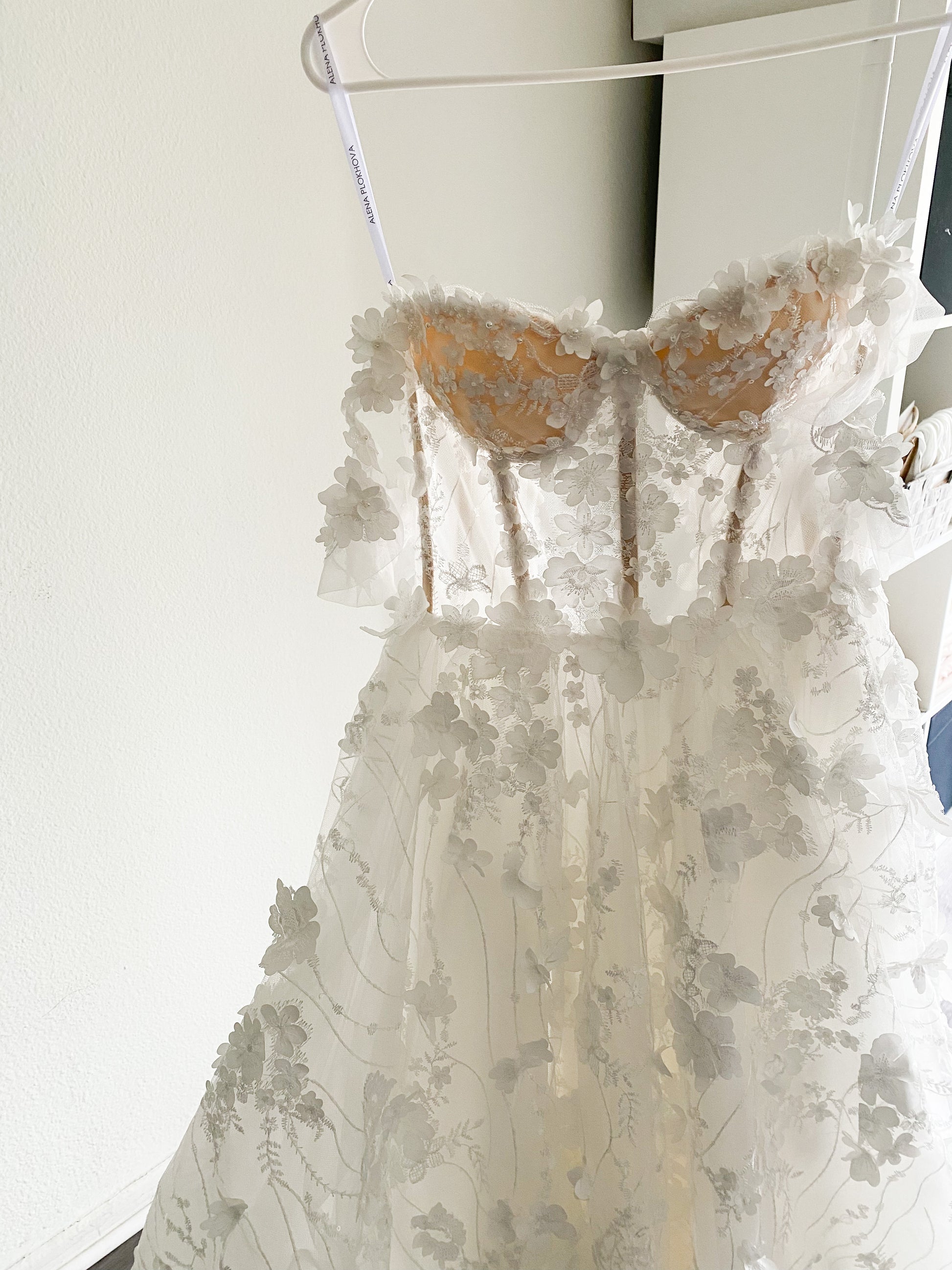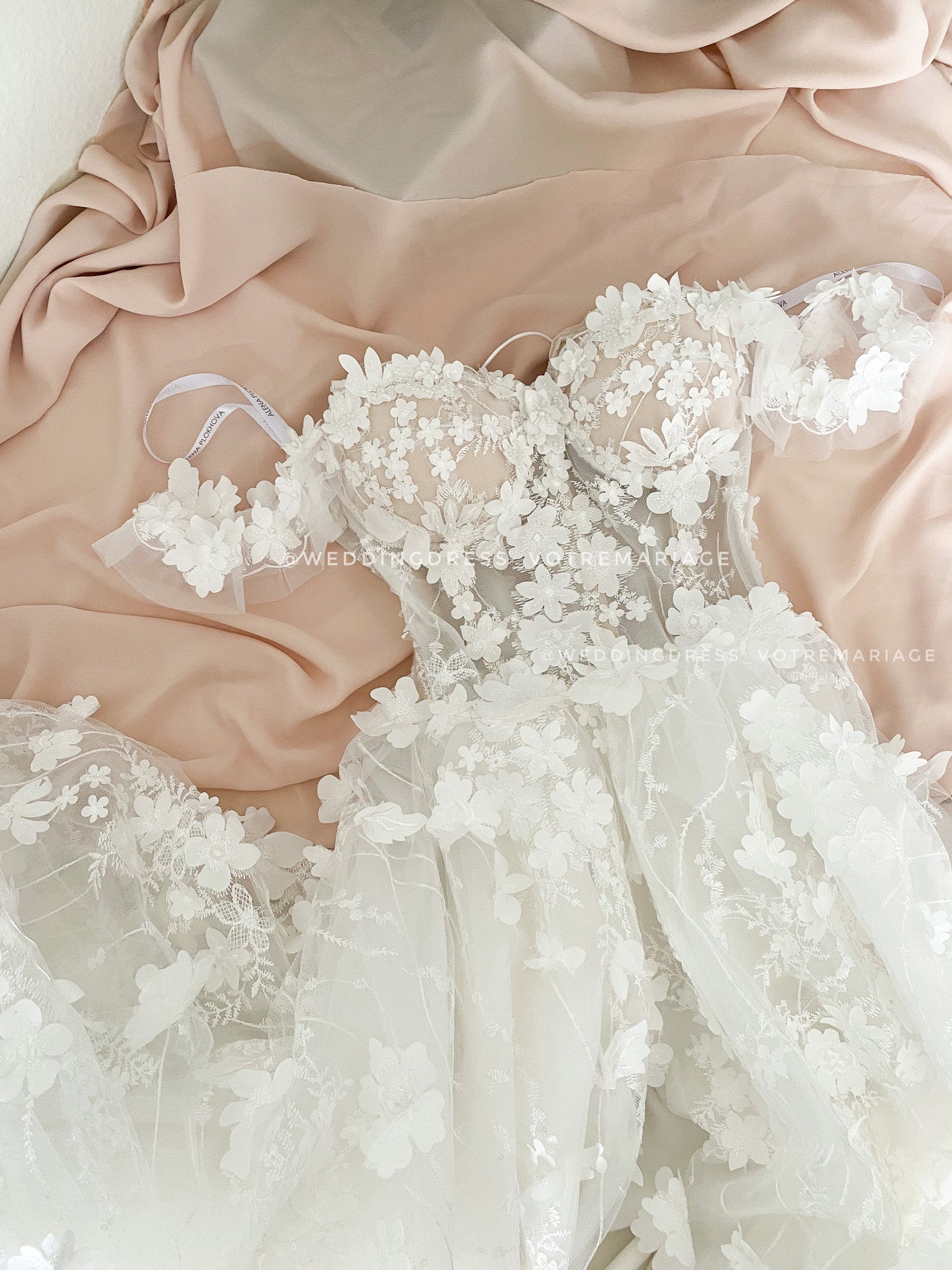 - Materials: Italian tulle, lace, 3D flowers, satin (polyester).The dress is embroidered with sequins and several types of beads.