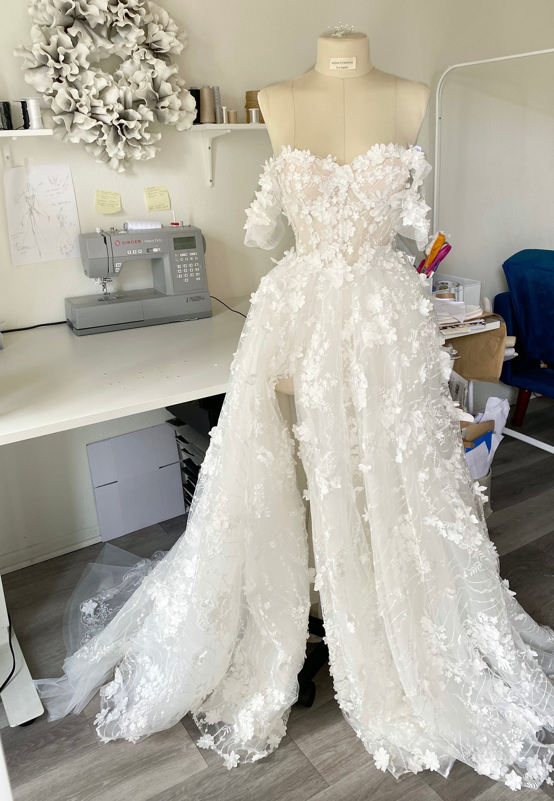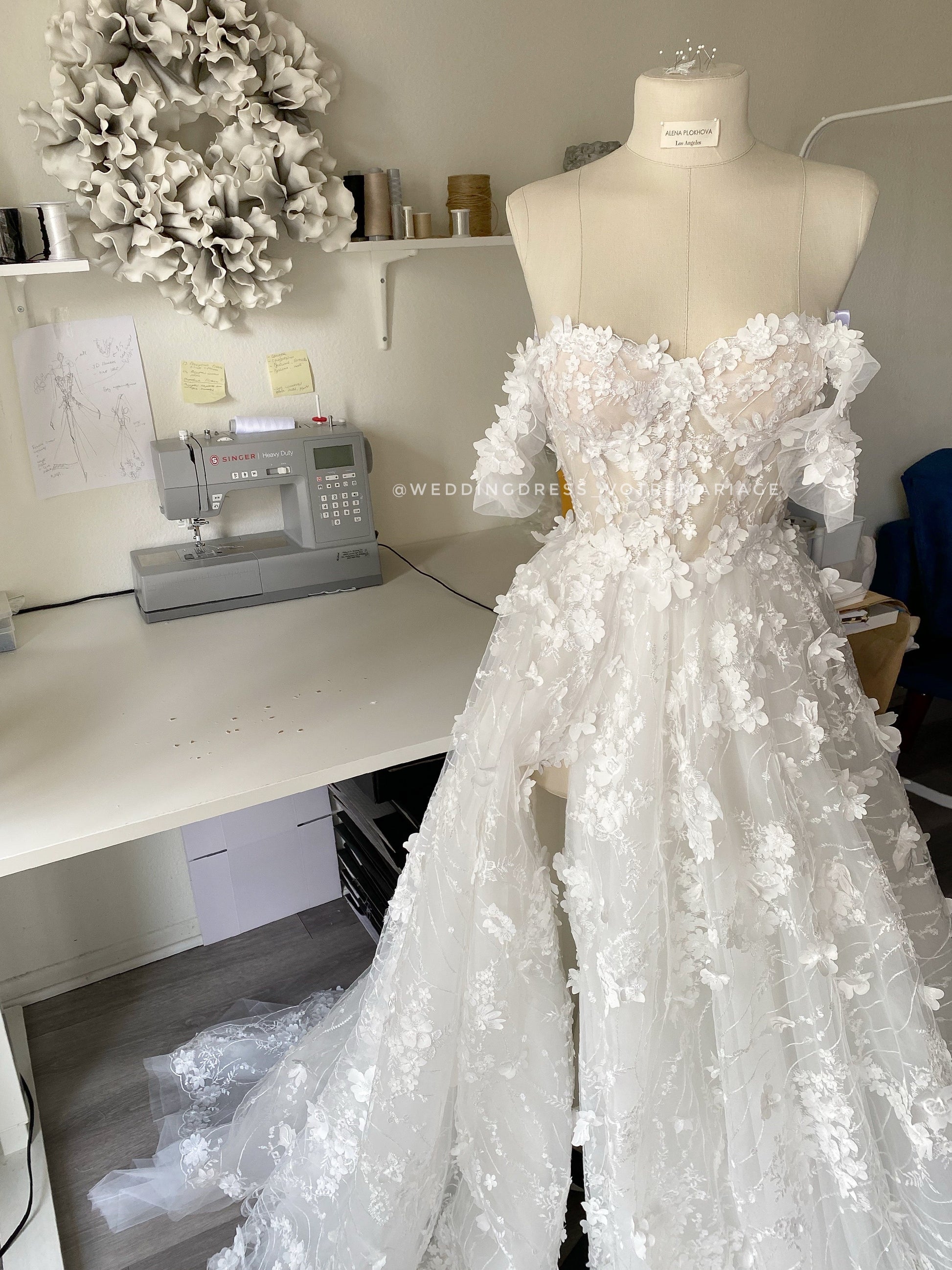 This dress was created individually for the bride according to a special sketch, the dress is really original and exclusive, because it is one of a kind. Especially for this dress, special fabrics were ordered and selected, each detail of the dress is created by hand from the cups of the corset to the embroidery of the dress.This dress is hand embroidered with 3D flowers and beads, completely handmade.