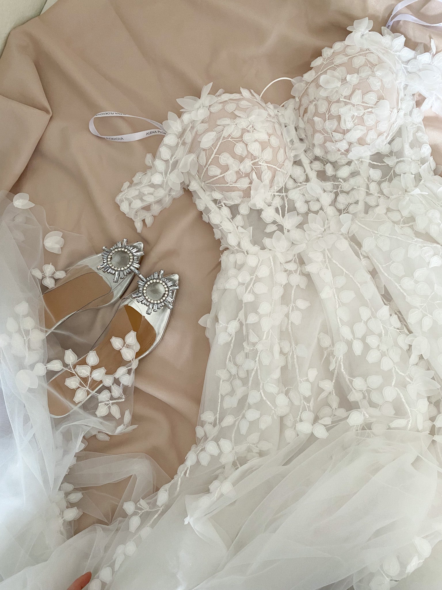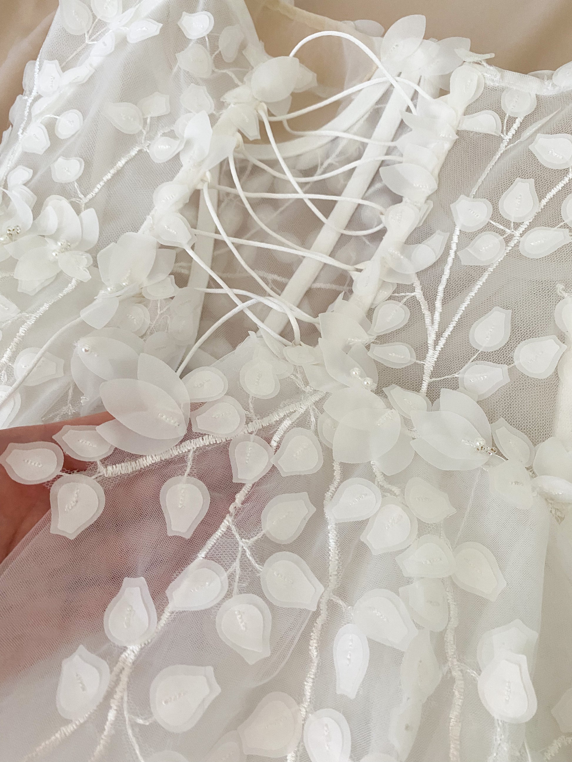 - Materials: Italian tulle, corset mesh, lace, 3D flowers, satin (polyester).