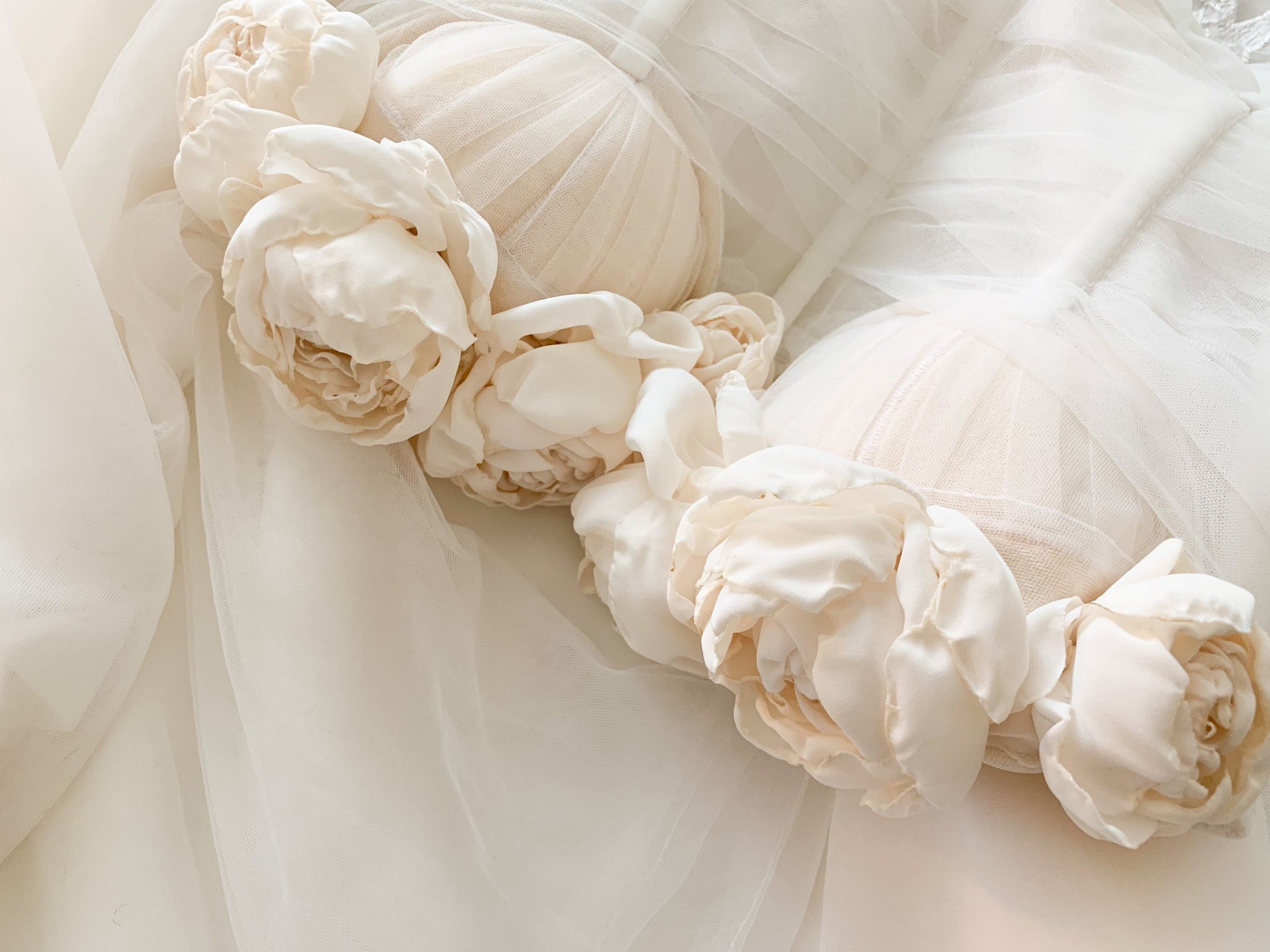 J’adore is one of the most popular dresses in the floral collection. A distinctive and special detail of this dress are handmade flowers. Each flower is handmade.