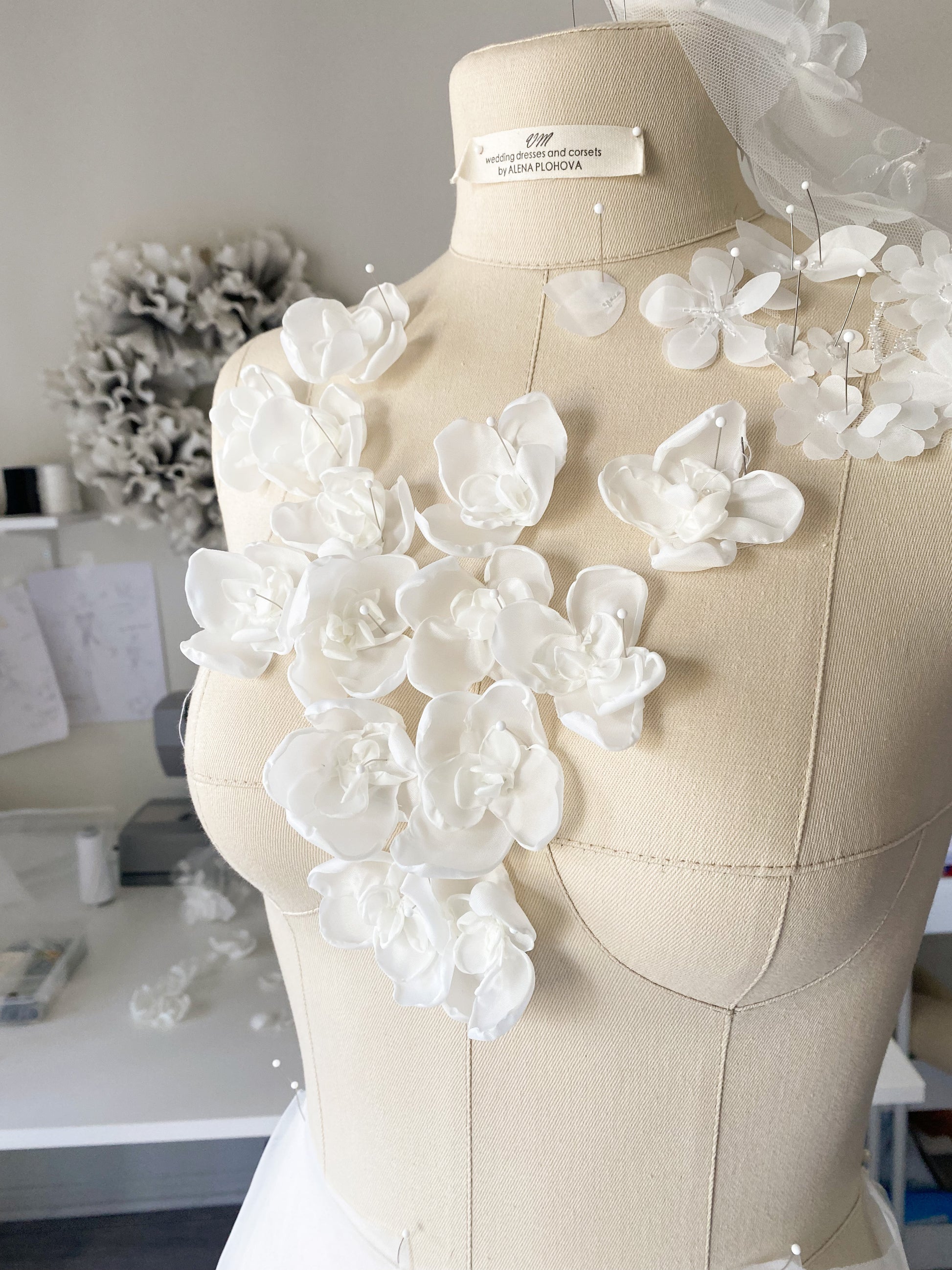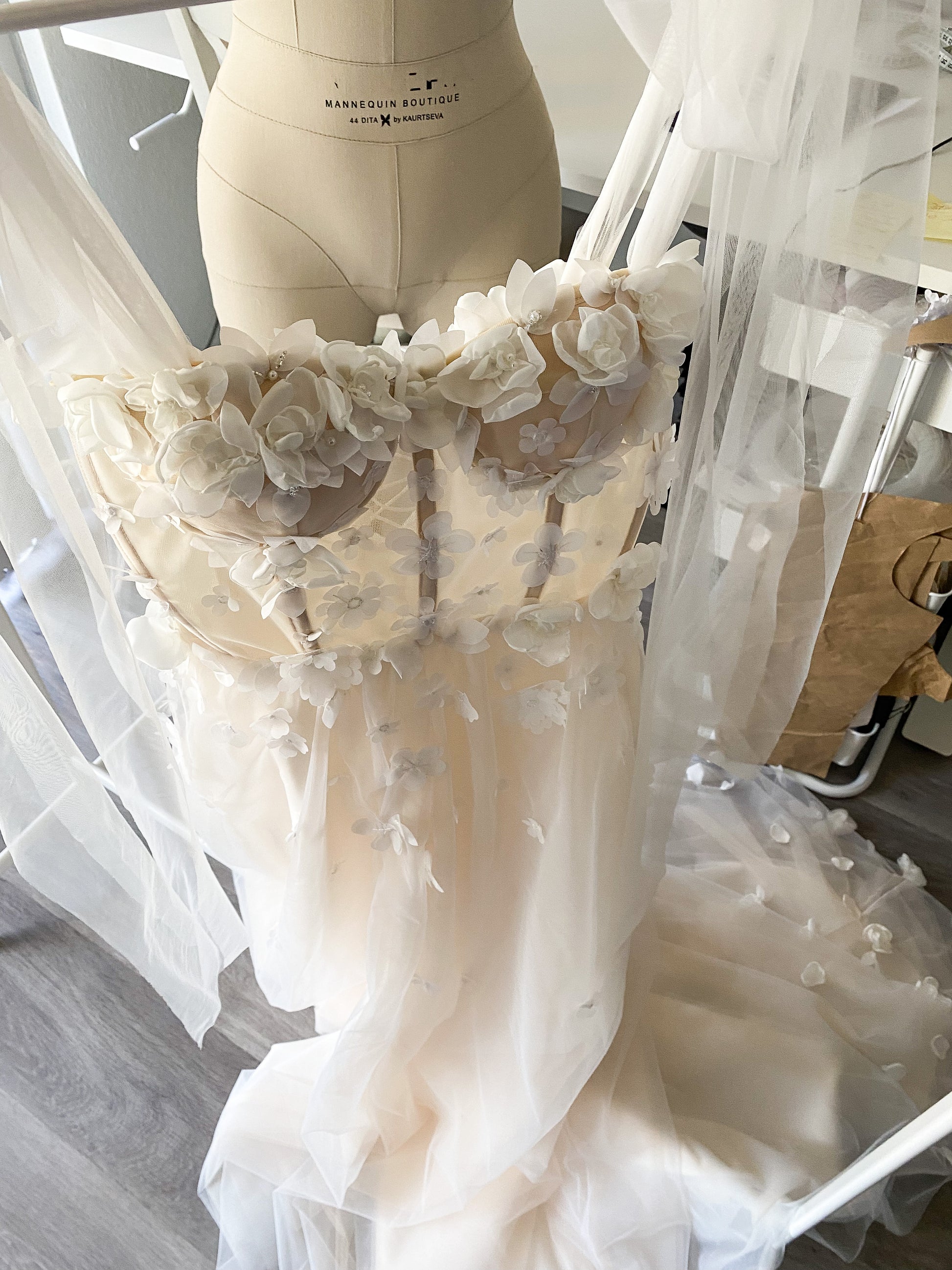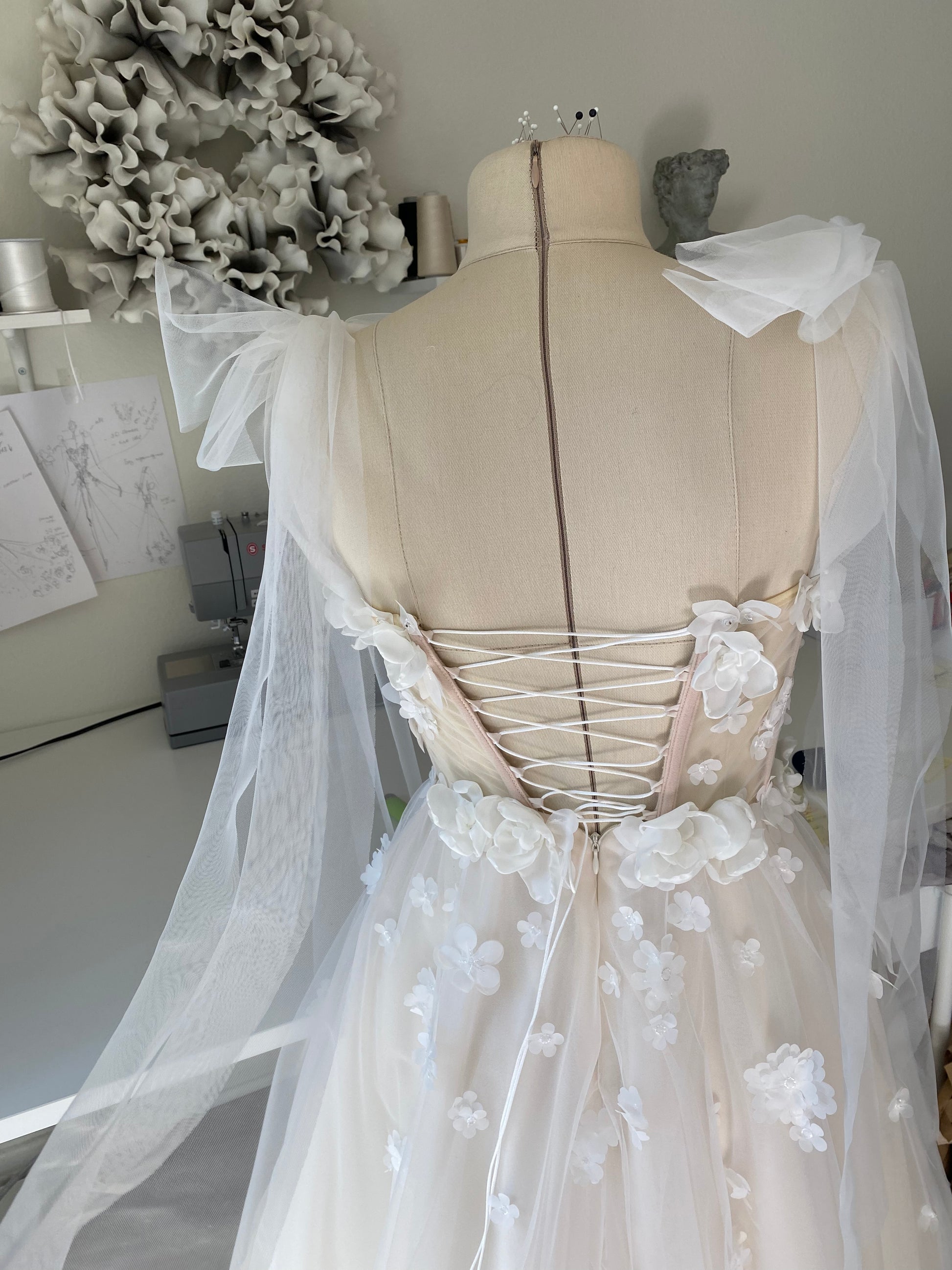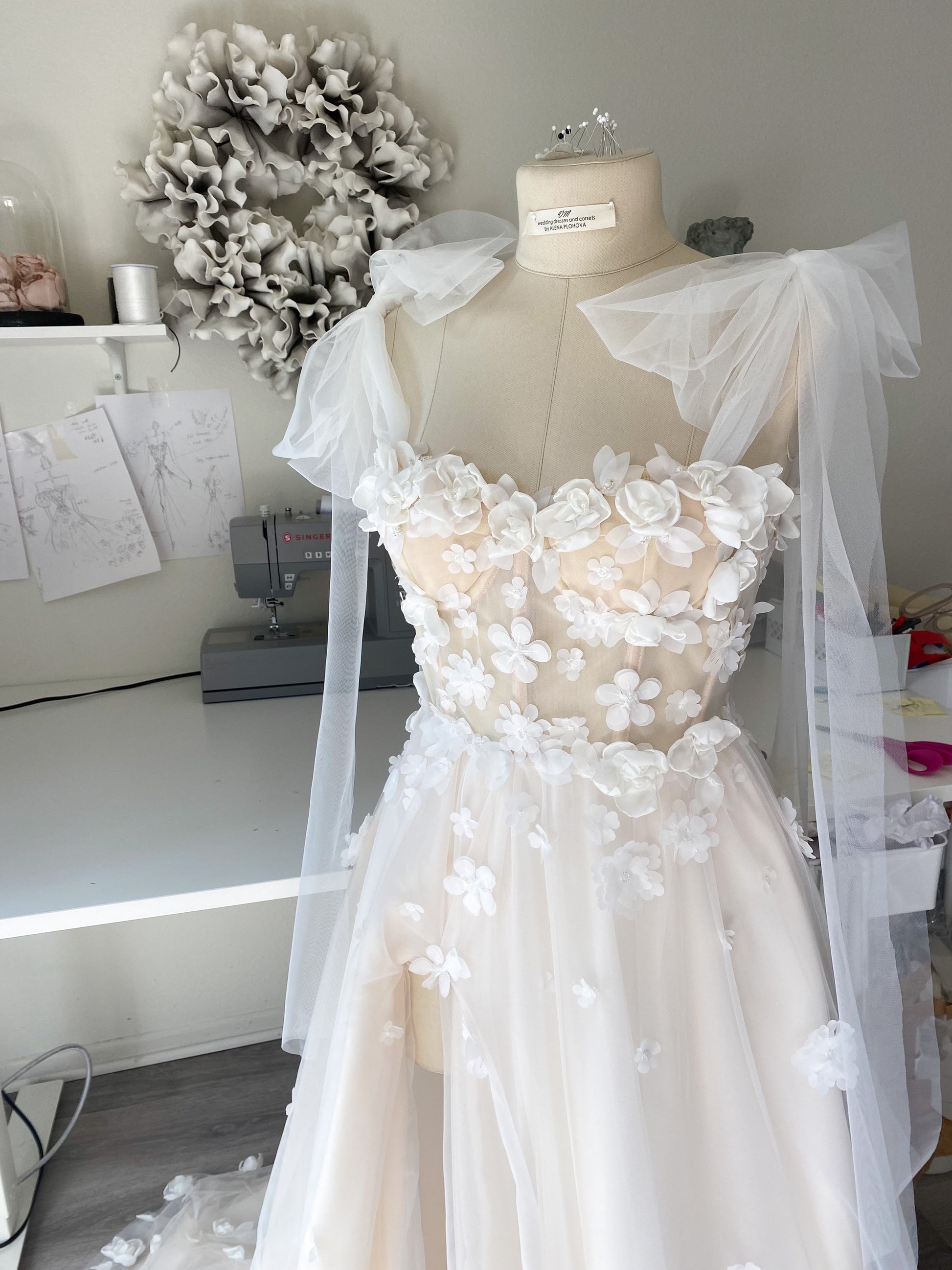 Jasmine is a special dress because every detail of this dress is made by hand. Each flower is handmade. The skirt of this dress is crafted from multiple layers of soft Italian tulle. The corset of the dress is made of nude mesh and covered with handmade petals. The dress has a train of 40 cm.