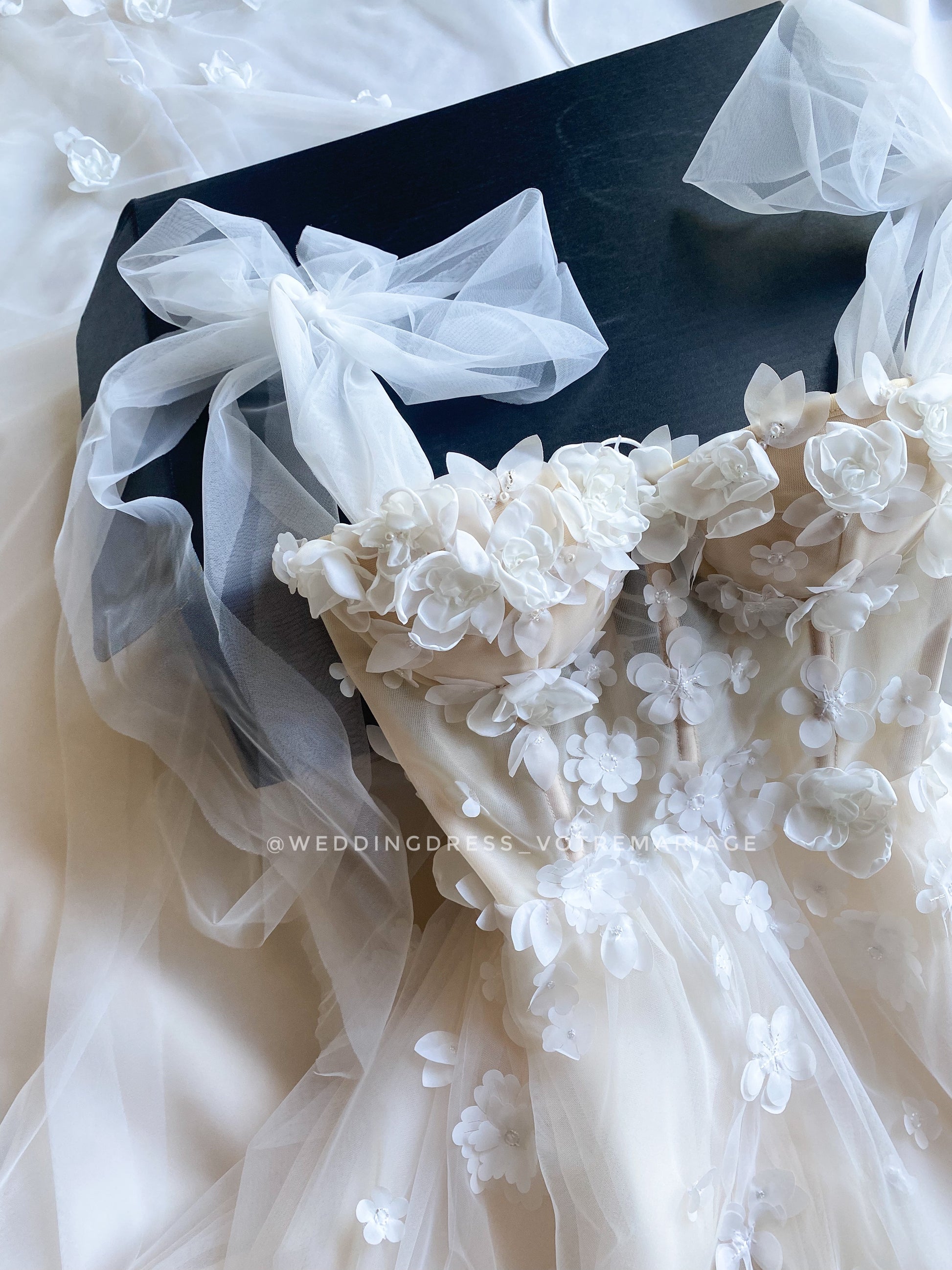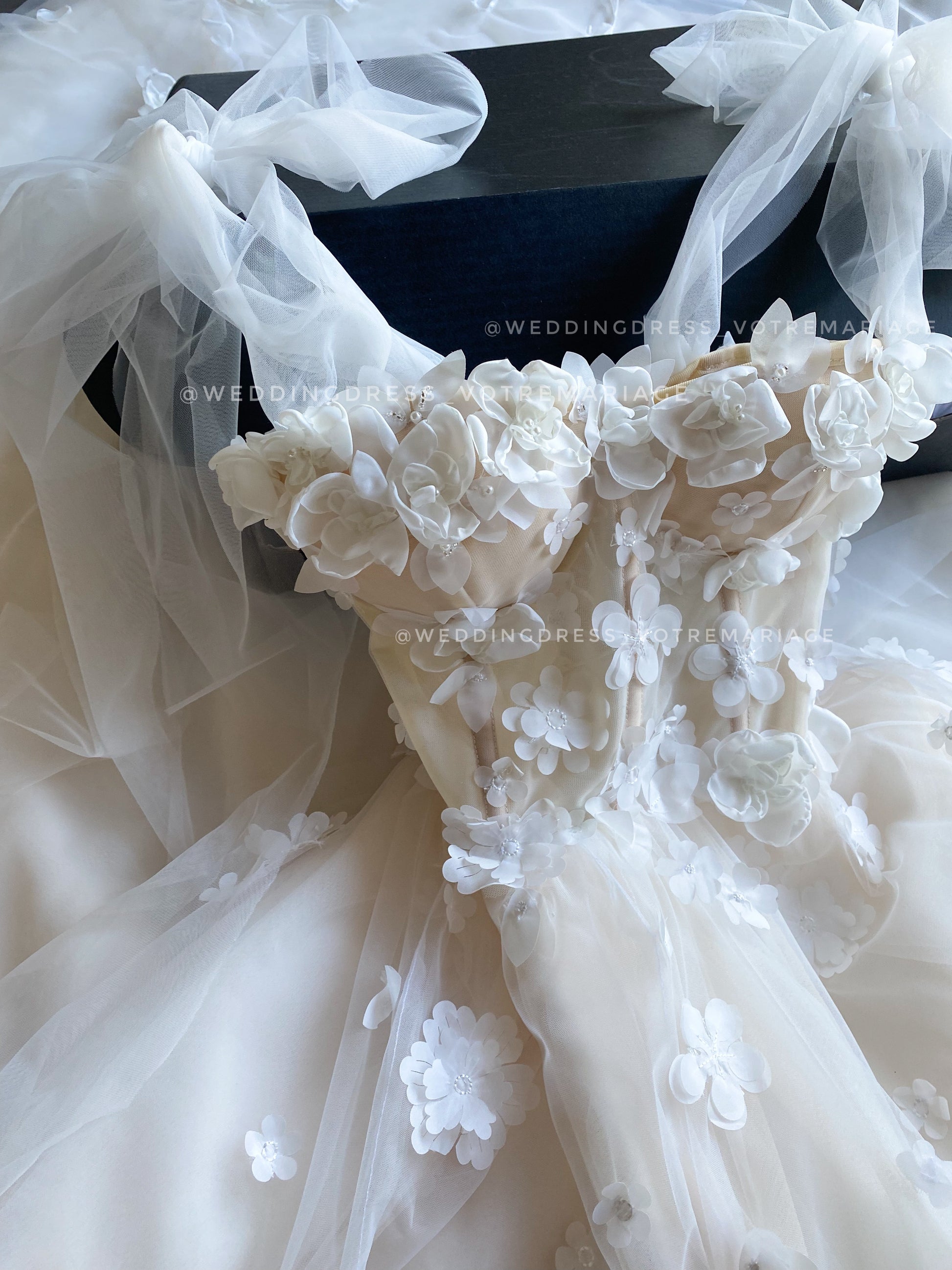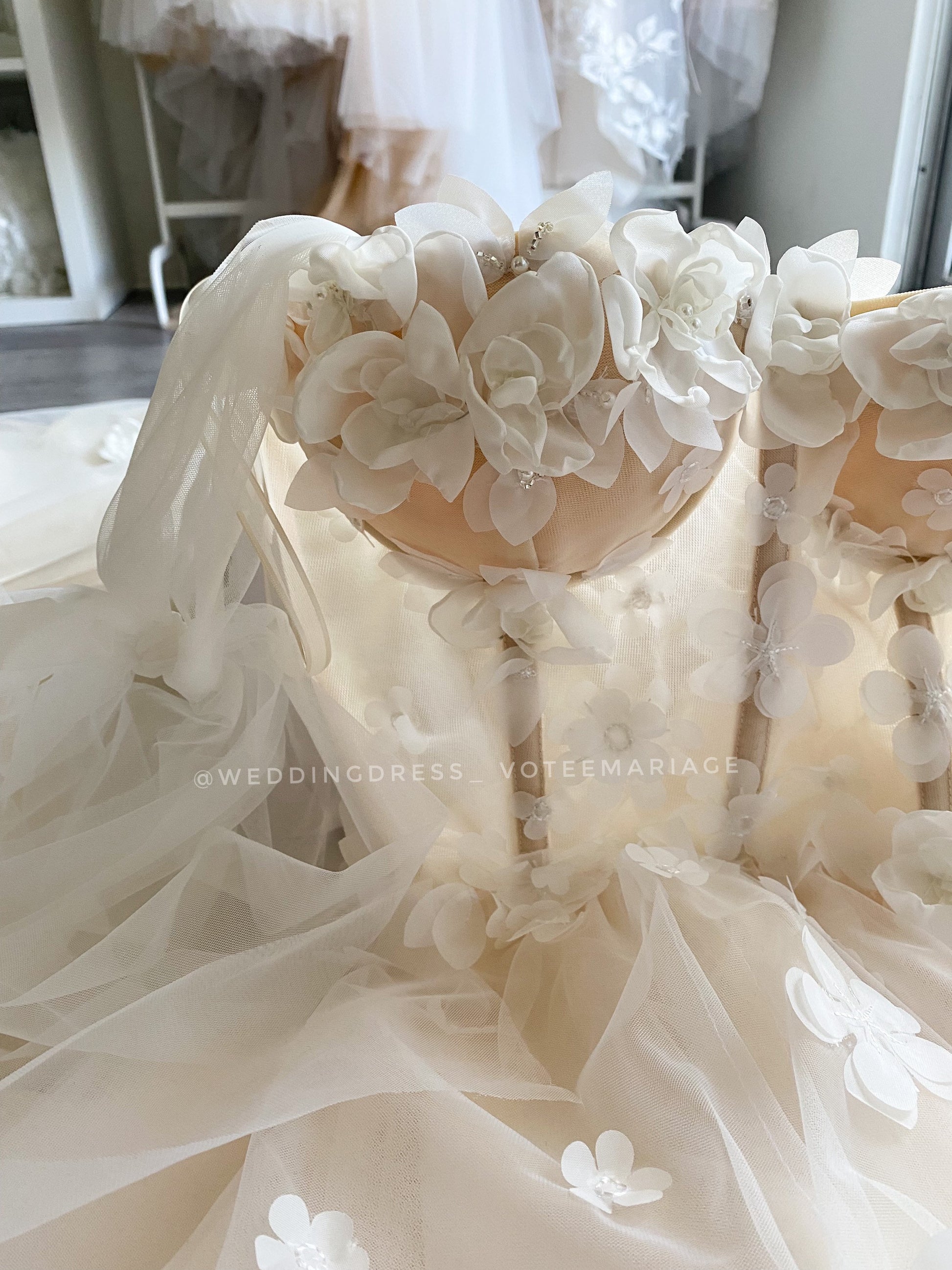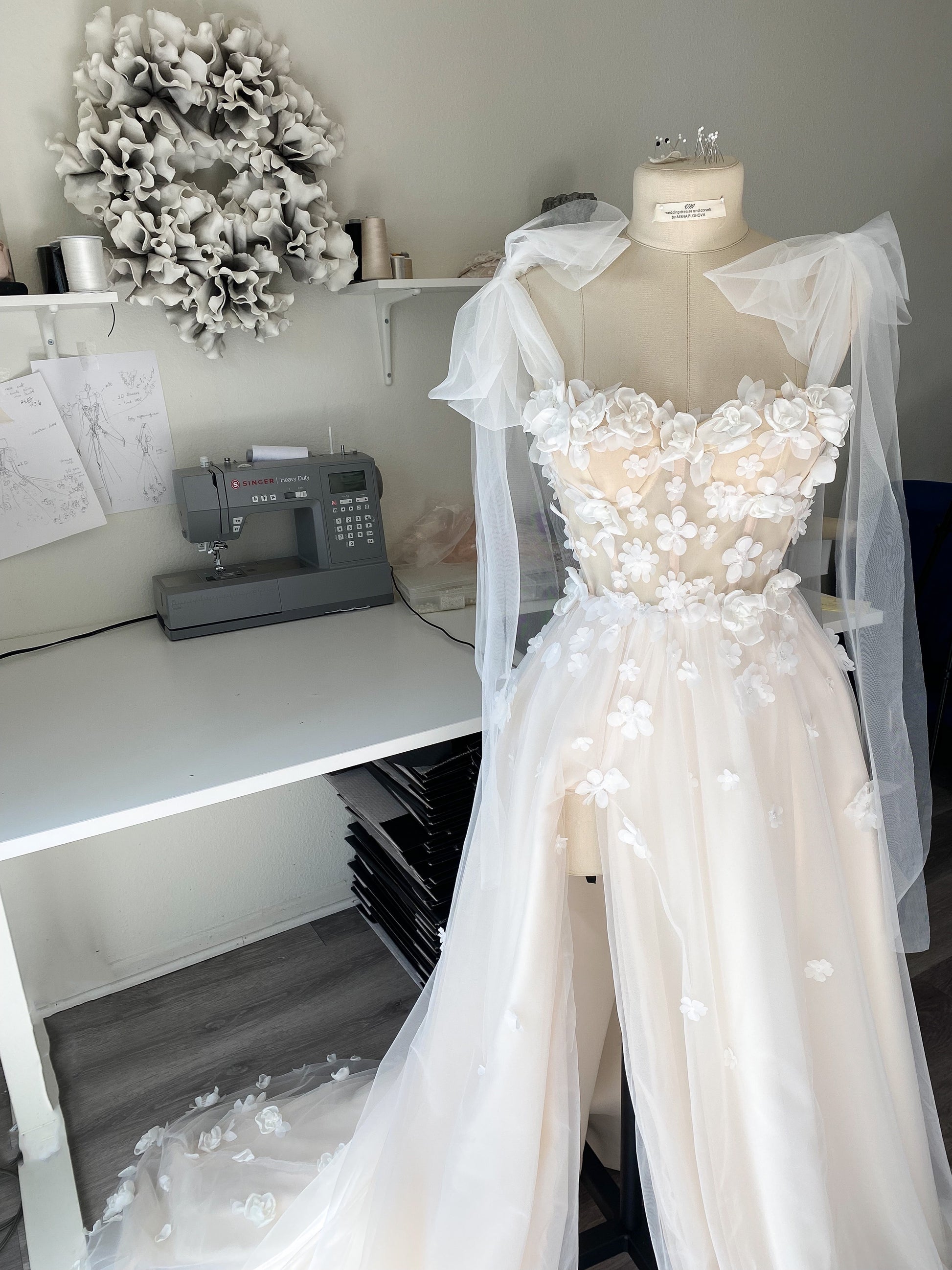 Jasmine is a special dress because every detail of this dress is made by hand. Each flower is handmade. The skirt of this dress is crafted from multiple layers of soft Italian tulle. The corset of the dress is made of nude mesh and covered with handmade petals. The dress has a train of 40 cm.