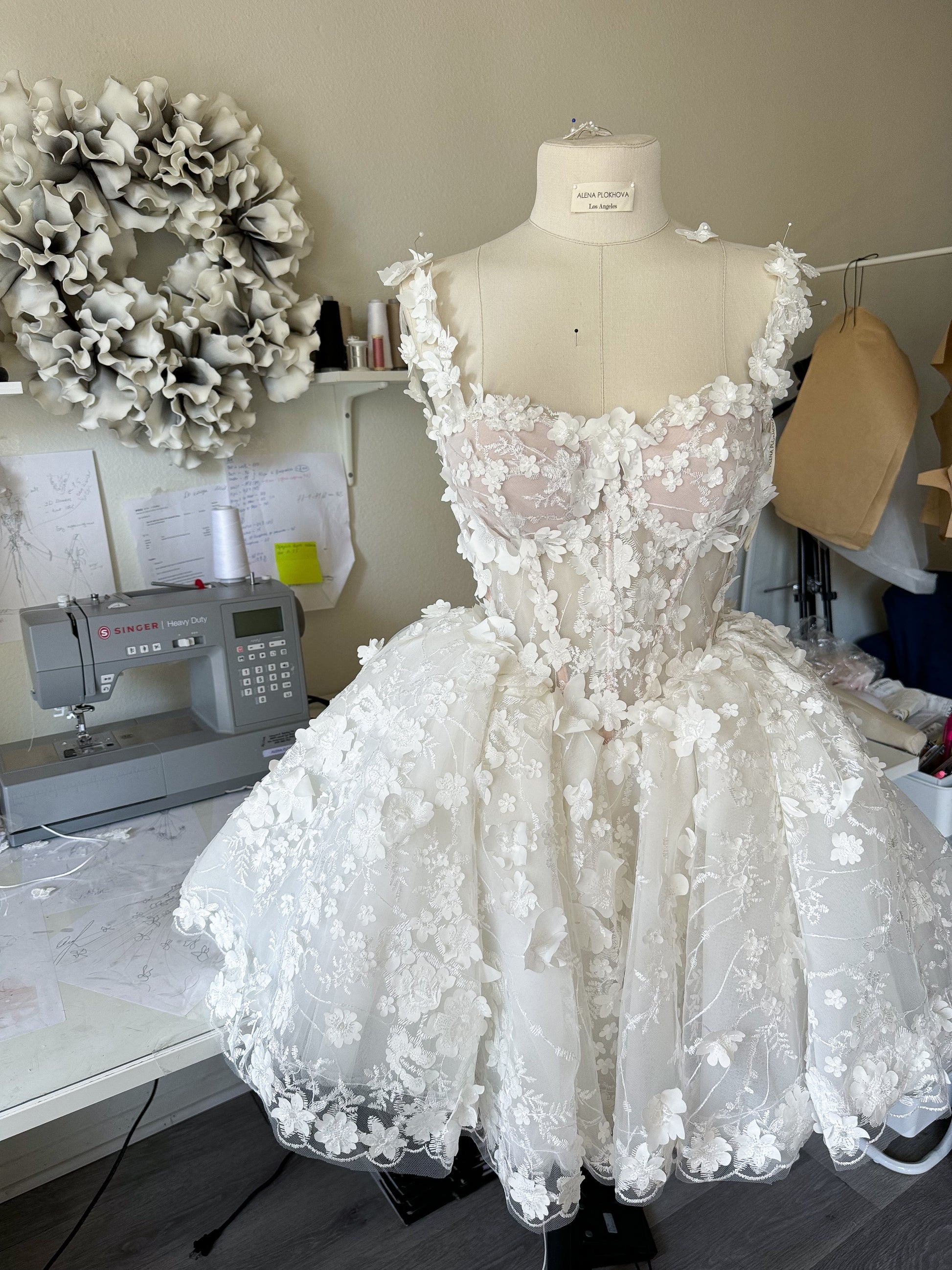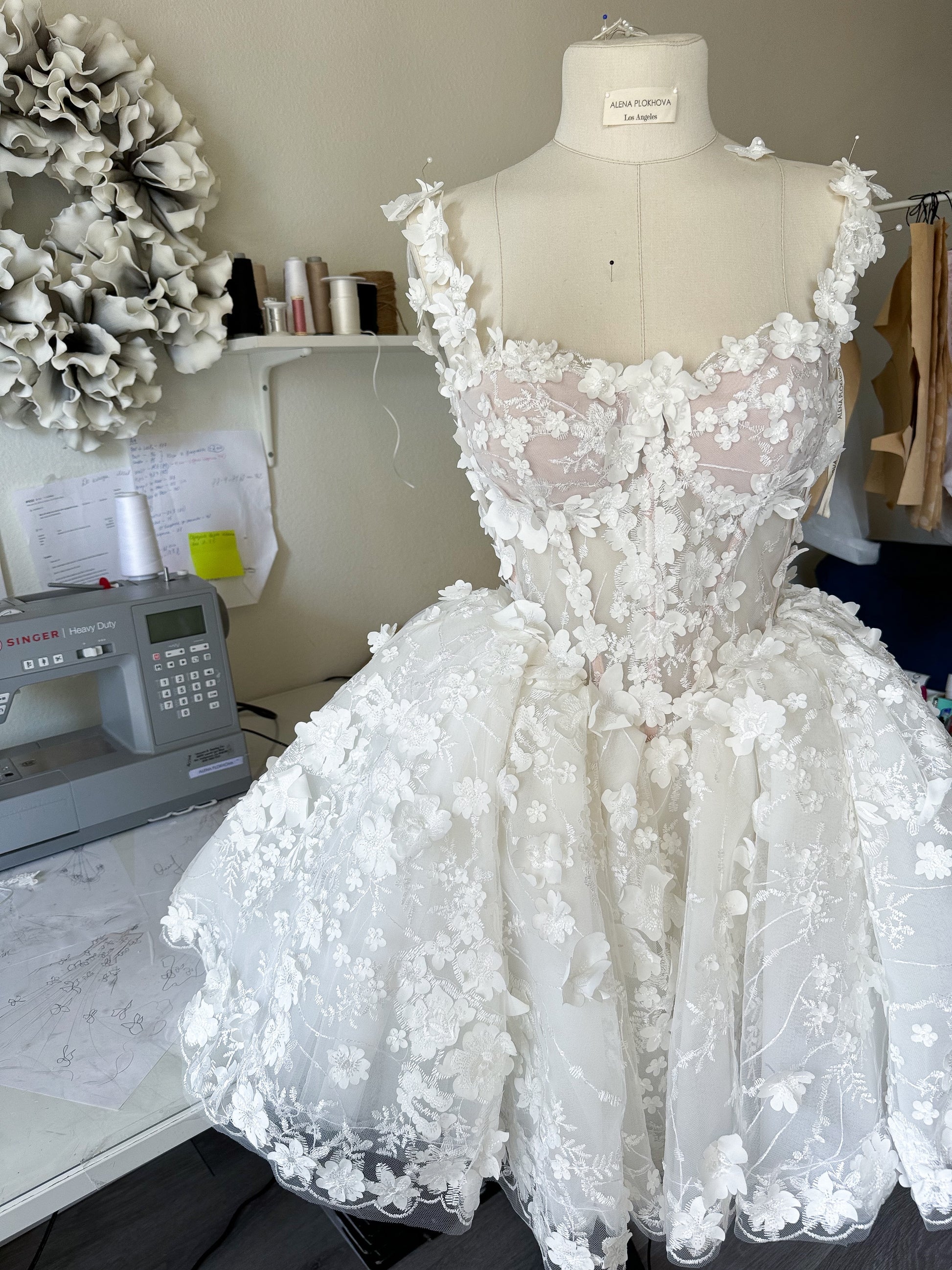 - Materials: Italian tulle, lace, 3D flowers, satin (polyester).The dress is embroidered with sequins and several types of beads.