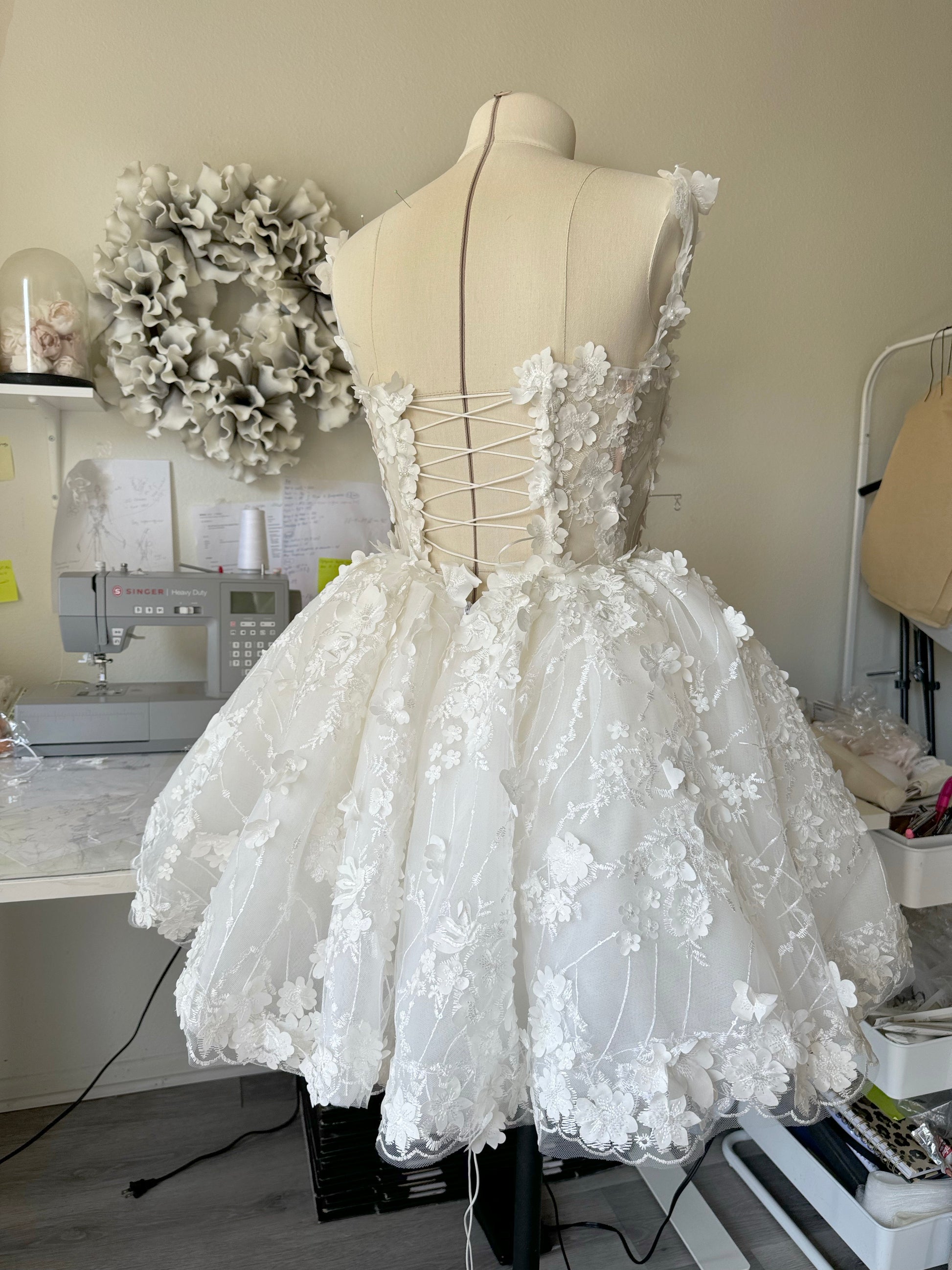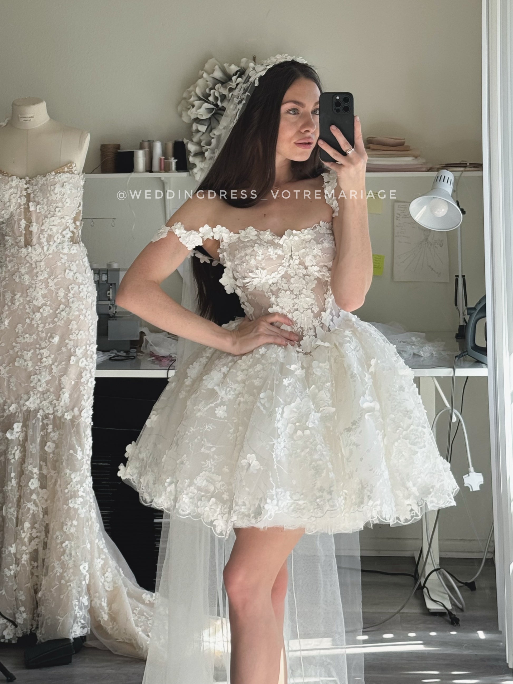 Alexa is a mini lace wedding dress embroidered with 3D lace and beads. The length of the dress skirt is 45 cm or 18 inches.
