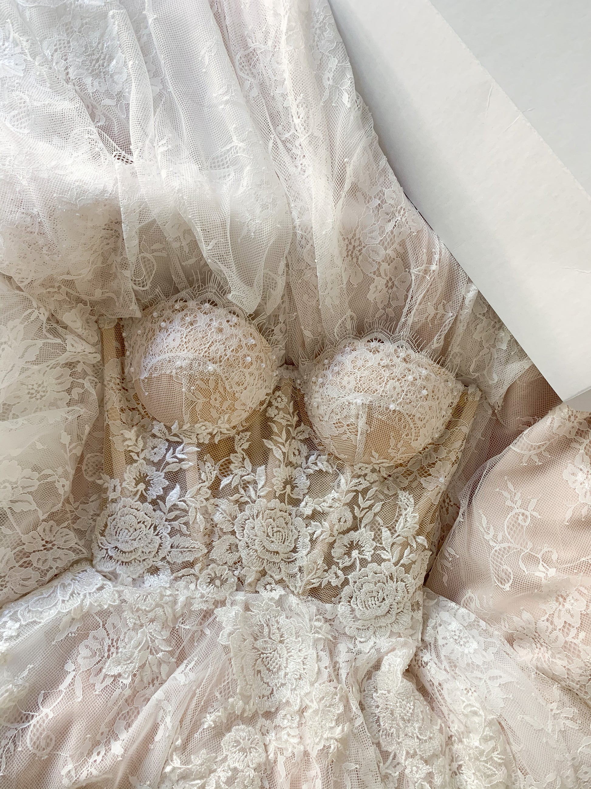 This dress is entirely made of fine French lace and embroidered with appliqué. The basis of the dress is a nude corset, which is also covered with lace.The length of the dress train is 8 inches.The corset is hand embroidered with beads.