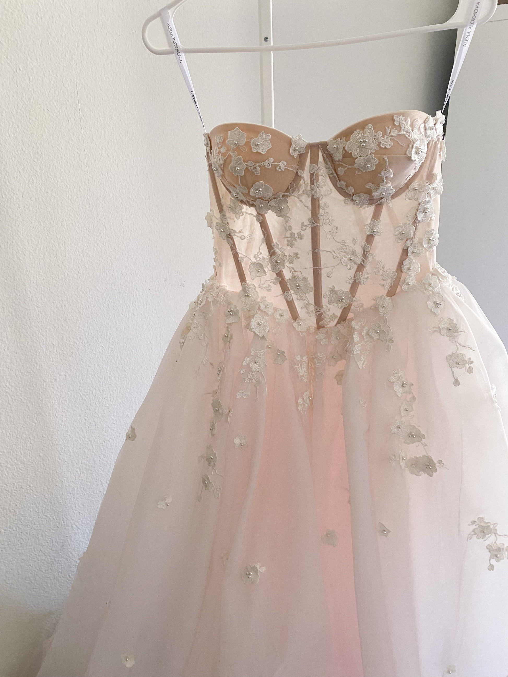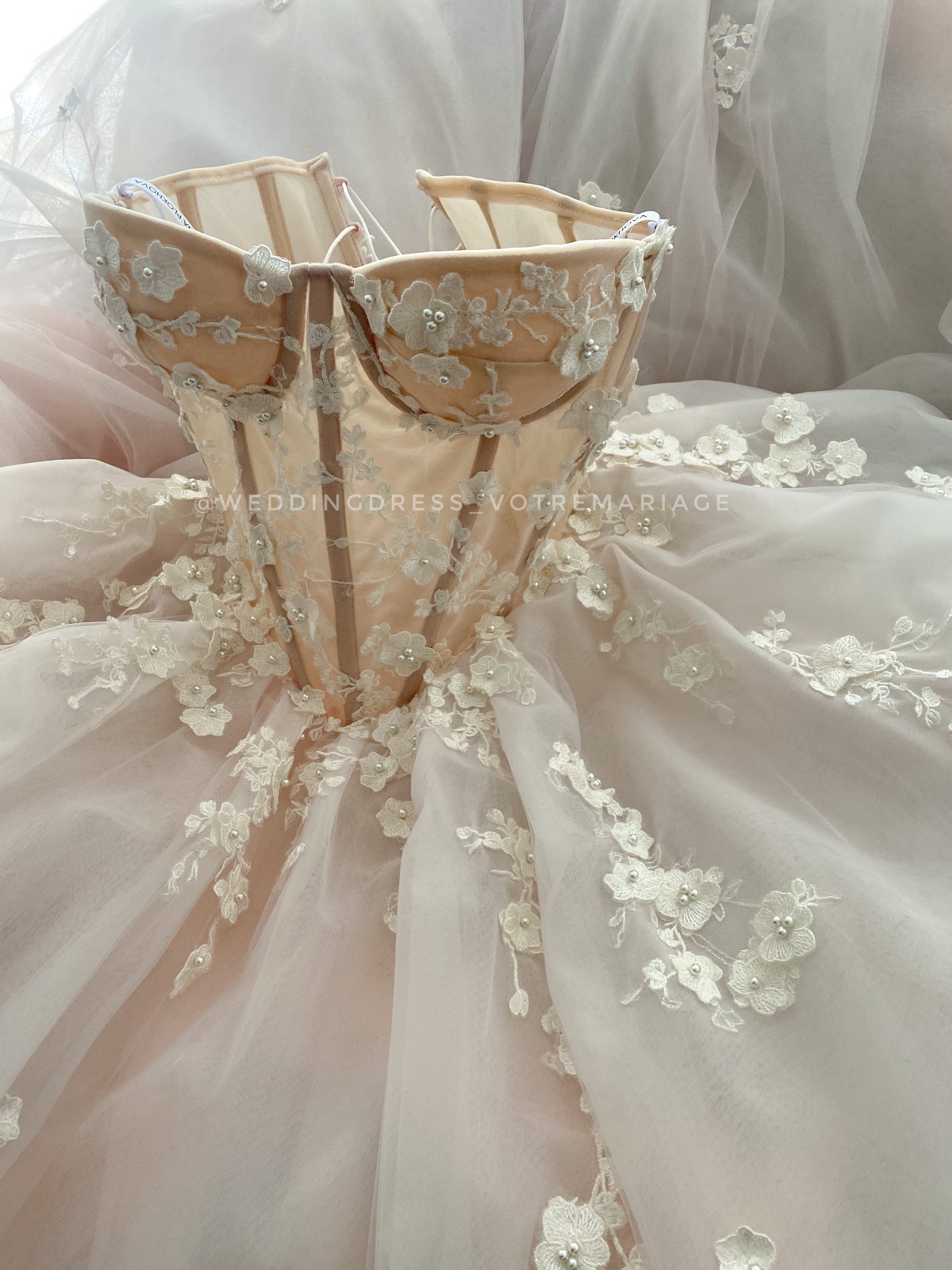 Exclusive wedding dress completely handmade. Akura is a puffy dress with a shade of light blush.This dress is made from several layers of Italian tulle and French lace. The corset and skirt are hand embroidered with flowers and beads. Completely handmade. The dress has a train of 40 cm.